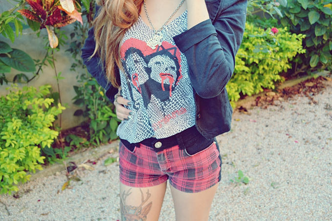 |Blazer (presente)| |Blusa (brechó) R$3,00| |Shorts (Marisa) não lembro o preço| |Alpargata (Avon/moleca)| |Colar (brechó) R$3,00| |Anel (brechó) R$2,00|